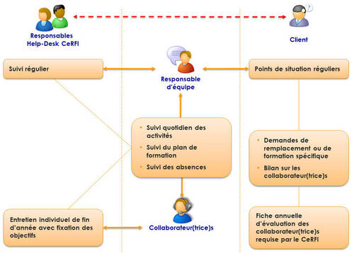 Le domaine Help-Desk est géré par un responsable de domaine assisté par 2 responsables de secteur (responsables clients). Ces 3 personnes gèrent les opérations avec les clients du CeRFI ainsi qu’avec les collaborateur(trice)s Help-Desk.